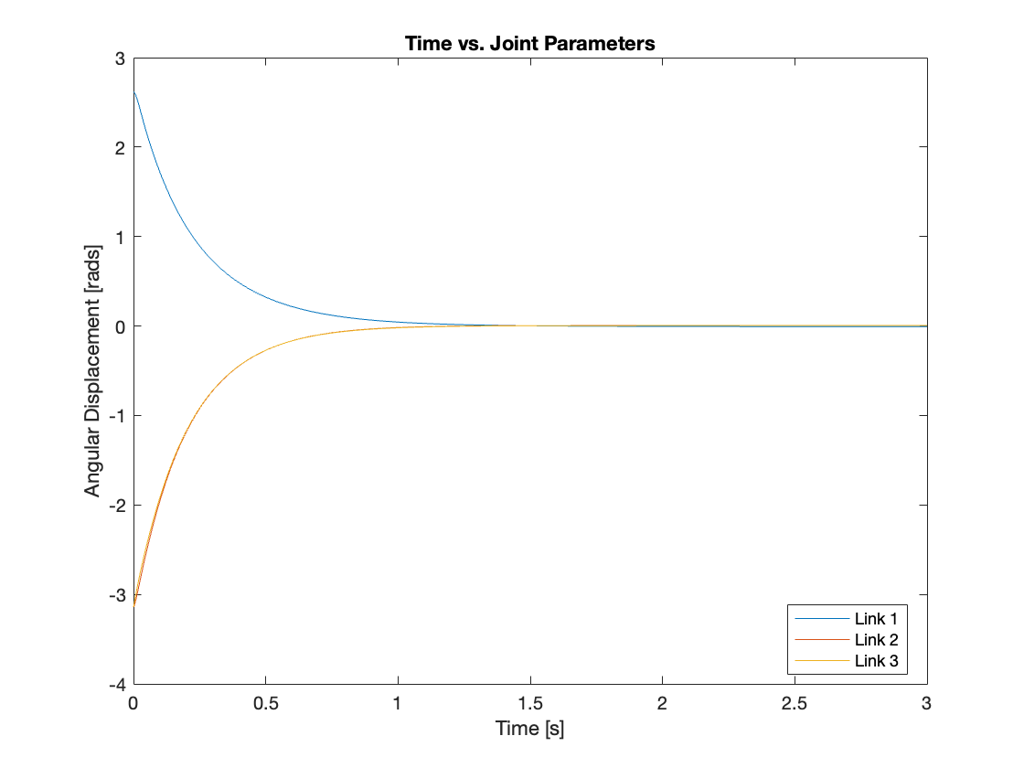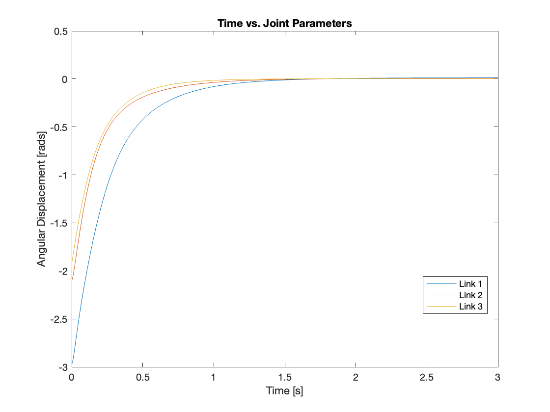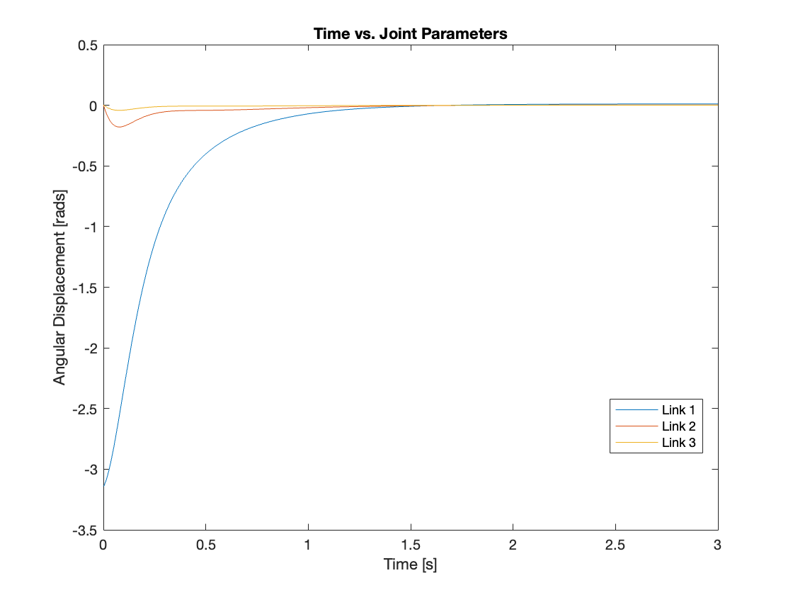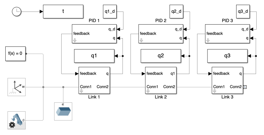 The overall system is depicted in Figure 1. This system closely resembles that of Day 1 but includes an added PID control subsystem. The angular displacement of each joint is input into the PID controller block, which calculates the feedback torque to actuate the joints.