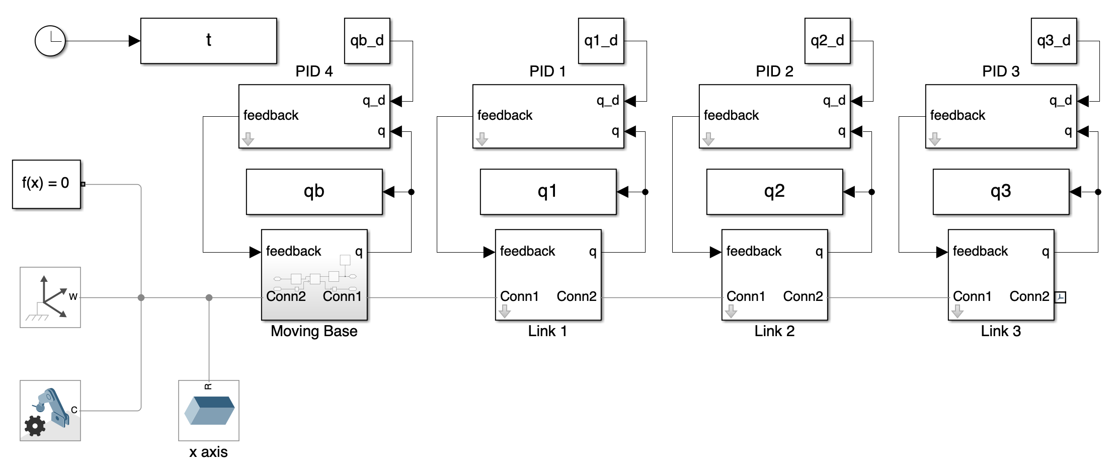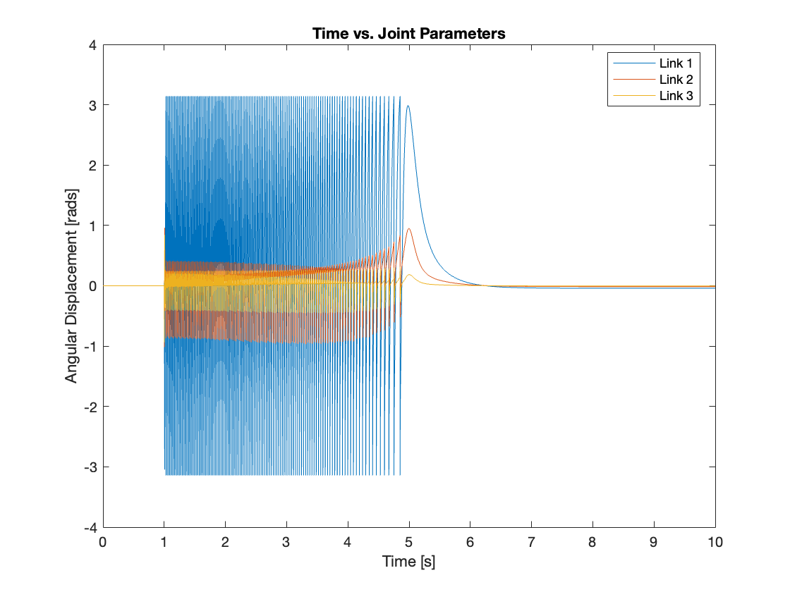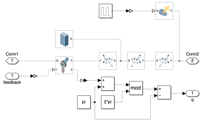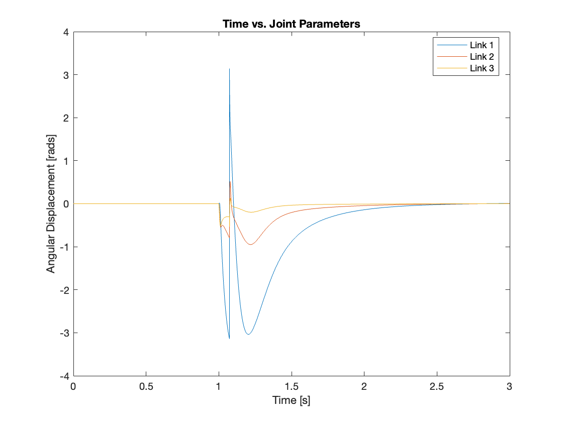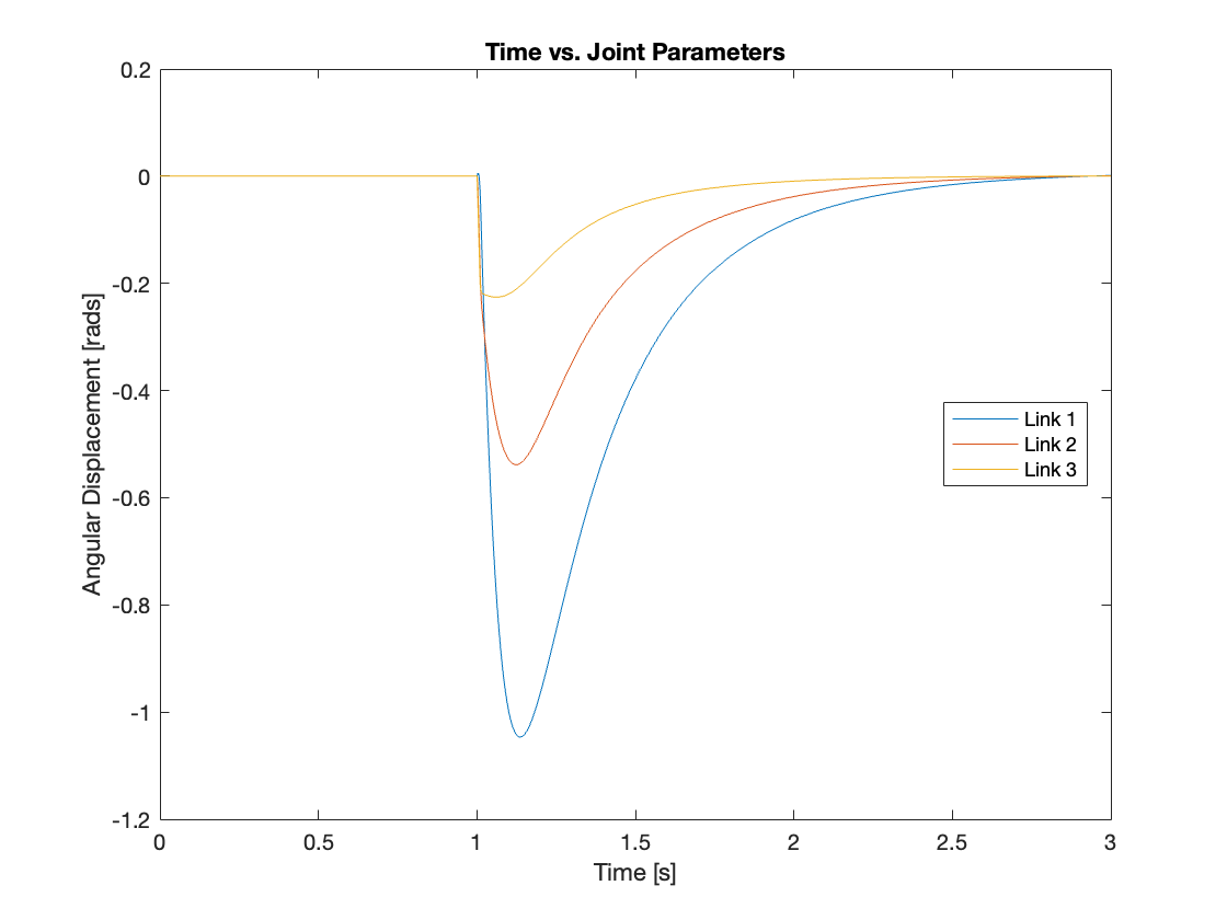 - Additionally, we’ve incorporated blocks to generate an impulsive external force at the end of link 3, to simulate external forces on the system and test its regulatory response.