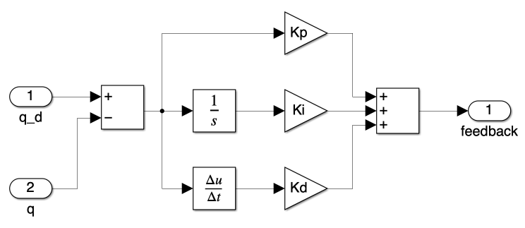 Figure 5 shows a PID controller subsystem. It begins by comparing a desired target (q_d) with an actual value (q) to determine the error, or the difference between what is desired and what exists. This error is then processed through three types of control: Proportional (Kp), which reacts to the current error; Integral (Ki), which addresses the accumulation of past errors; and Derivative (Kd), which predicts future errors. The outputs from these controls are combined to produce a feedback signal that adjusts the system to minimize the error, helping maintain the desired output.