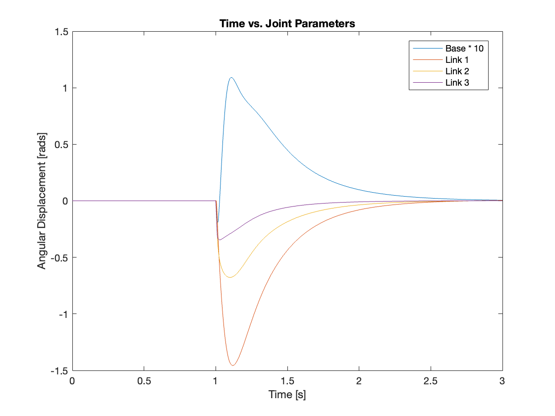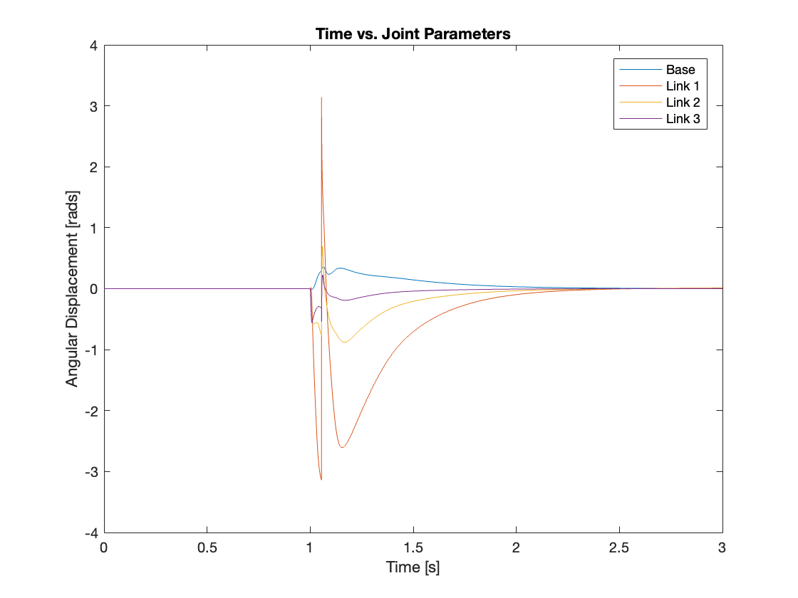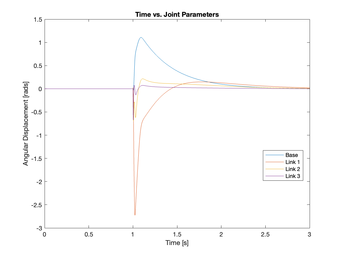 Videos 5 through 9 demonstrate the robust regulating capabilities of the control system, which efficiently rejects disturbances and maintains the reference position. Meanwhile, Figures 6 through 9 analyze the angular displacement under various disturbances. Specifically, Videos 6 and 7, along with Figures 11 and 12, showcase a simulation of a triple-link mechanism subjected to a substantial disturbance, significant enough to potentially cause a single rotation. However, in these demonstrations, the multi-link mechanism rotates almost twice. Similarly, As demonstrated in Video 8 and Figure 13, the system exhibits prolonged regulation times when subjected to a strong disturbance. We suspect this excessive rotation is due to the control system not accounting for the angular velocity and angular acceleration of the multi-link mechanism. This oversight in the control strategy leads to an over-response to the disturbance. We am uncertain whether this issue can be addressed by tuning the PID controller or changing system parameters. Please leave a comment if you have any ideas.