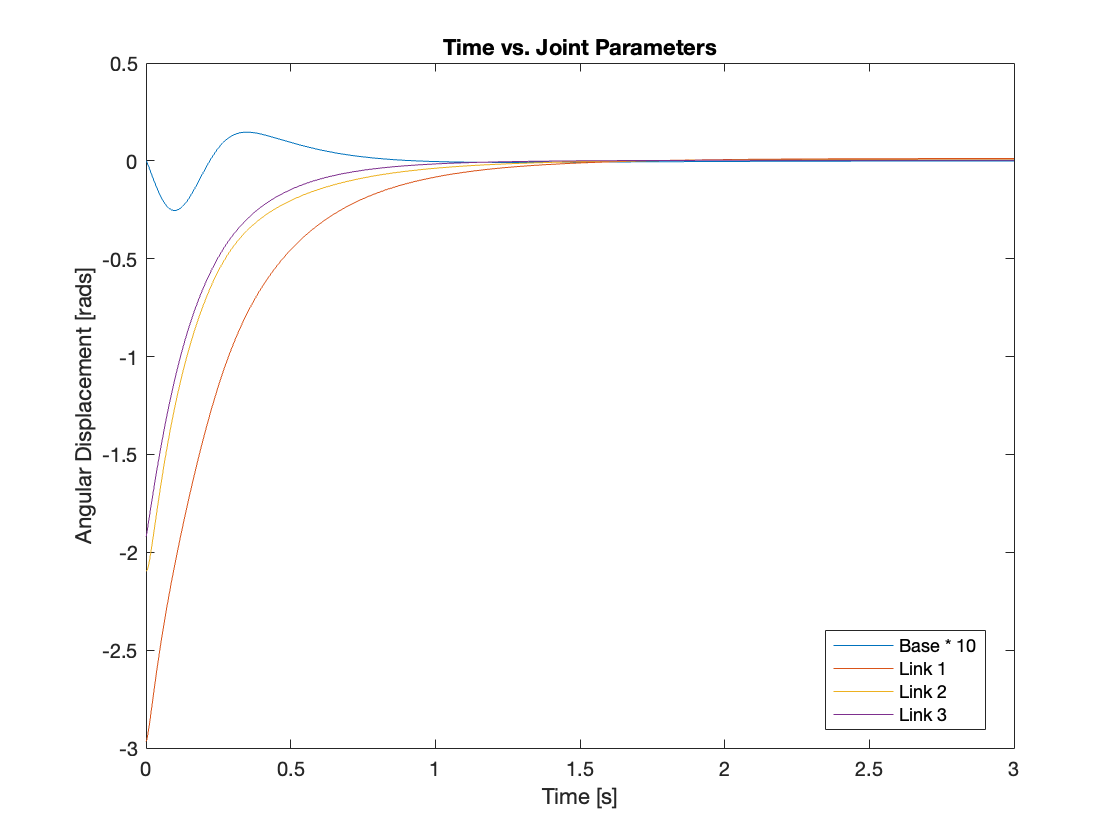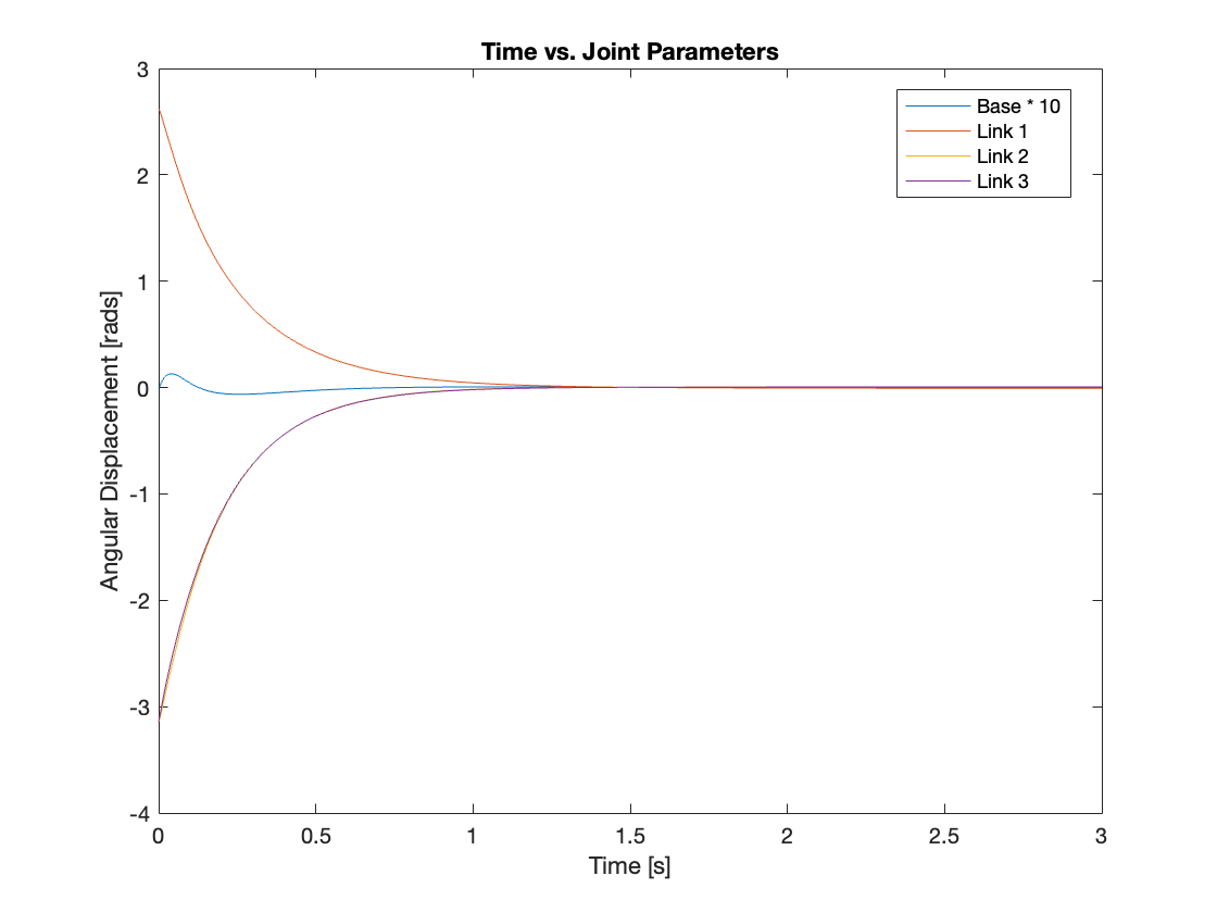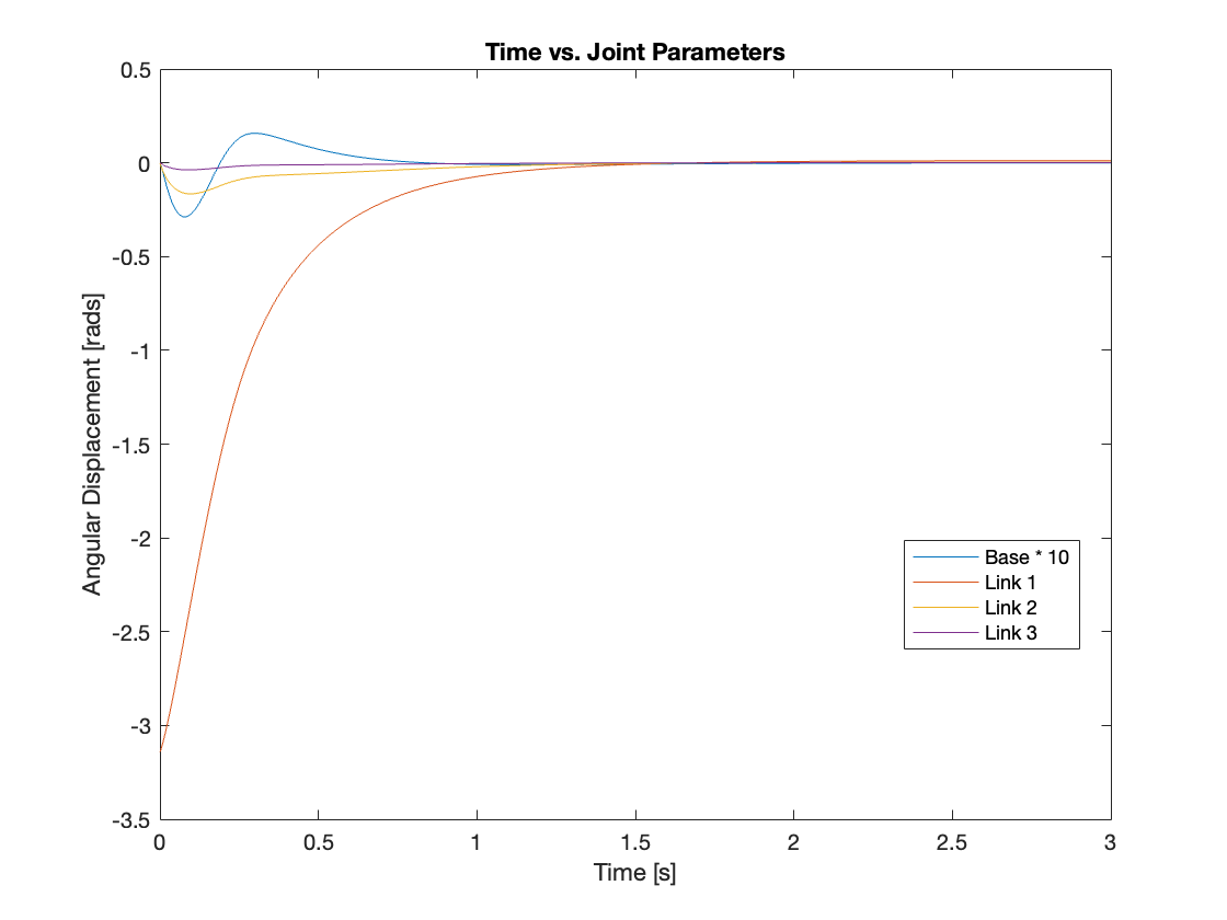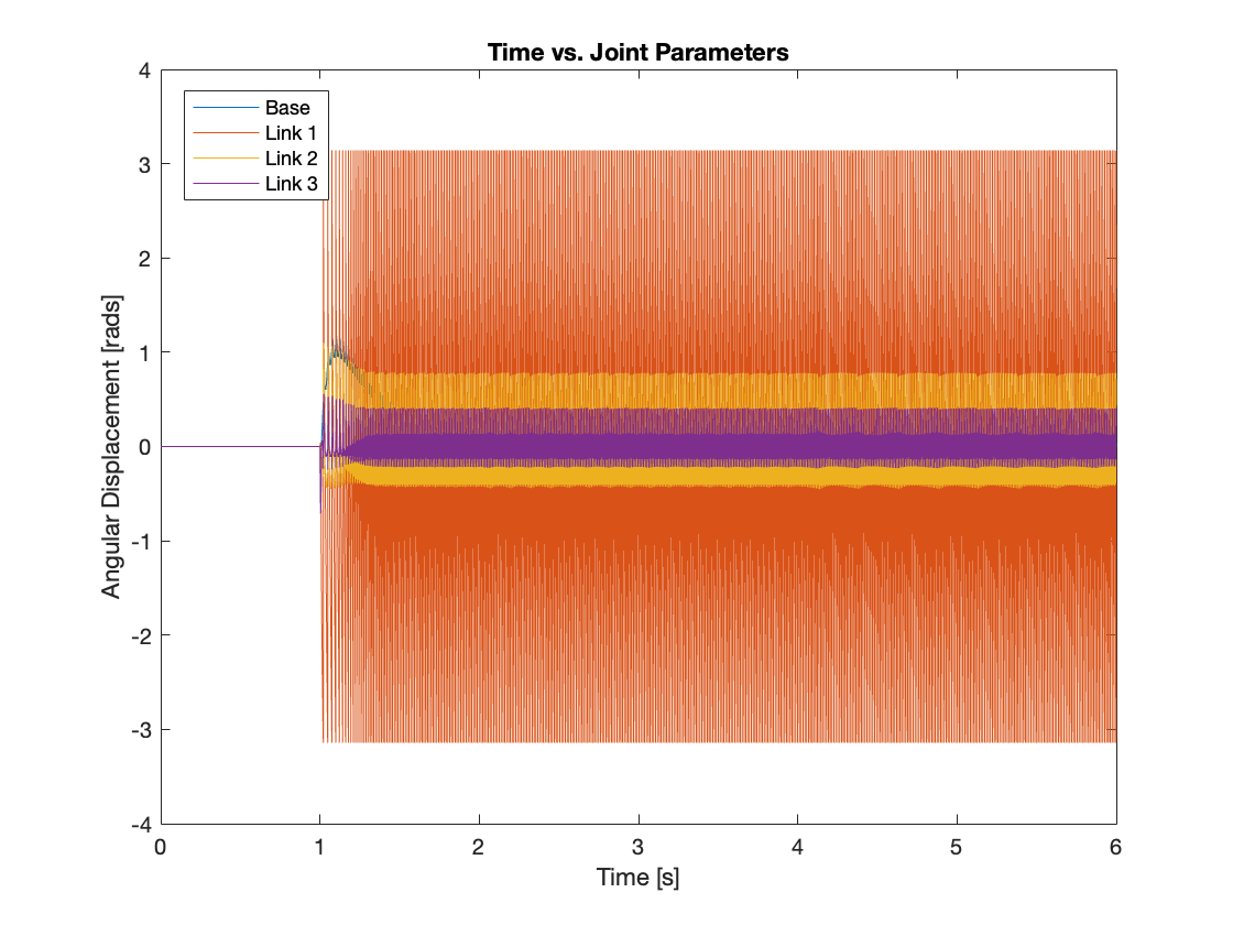 Videos 5 through 9 demonstrate the robust regulating capabilities of the control system, which efficiently rejects disturbances and maintains the reference position. Meanwhile, Figures 6 through 9 analyze the angular displacement under various disturbances. Specifically, Videos 6 and 7, along with Figures 11 and 12, showcase a simulation of a triple-link mechanism subjected to a substantial disturbance, significant enough to potentially cause a single rotation. However, in these demonstrations, the multi-link mechanism rotates almost twice. Similarly, As demonstrated in Video 8 and Figure 13, the system exhibits prolonged regulation times when subjected to a strong disturbance. We suspect this excessive rotation is due to the control system not accounting for the angular velocity and angular acceleration of the multi-link mechanism. This oversight in the control strategy leads to an over-response to the disturbance. We am uncertain whether this issue can be addressed by tuning the PID controller or changing system parameters. Please leave a comment if you have any ideas.